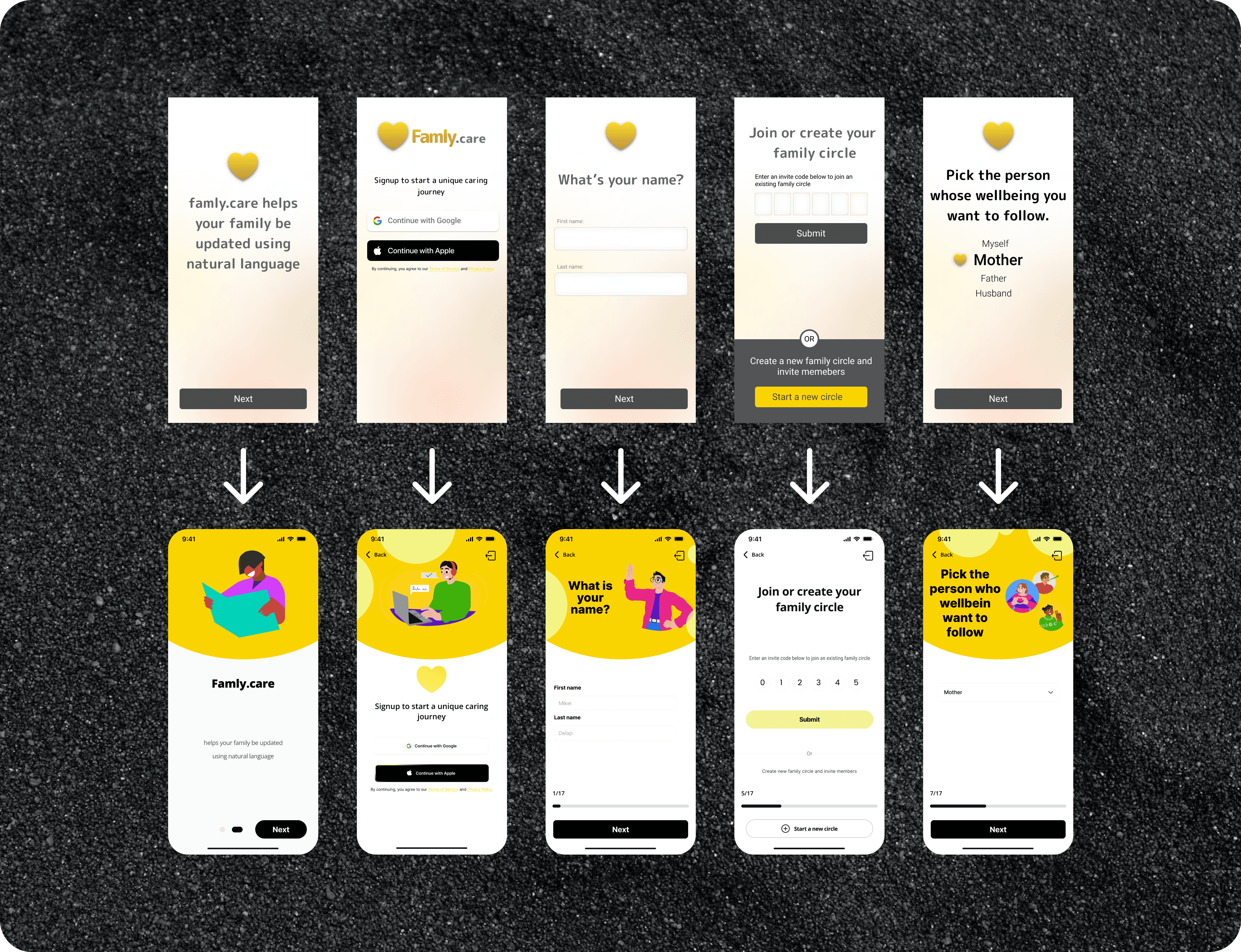 Family.care its app helping you to contact your family and take care of them if you are living far from them, specailay for old parents who for example have medical issues, the client told me he want improve the UI of the onboarding pages, it was 20 onboarding pages and he told me i only can use the color yellow for all screens.